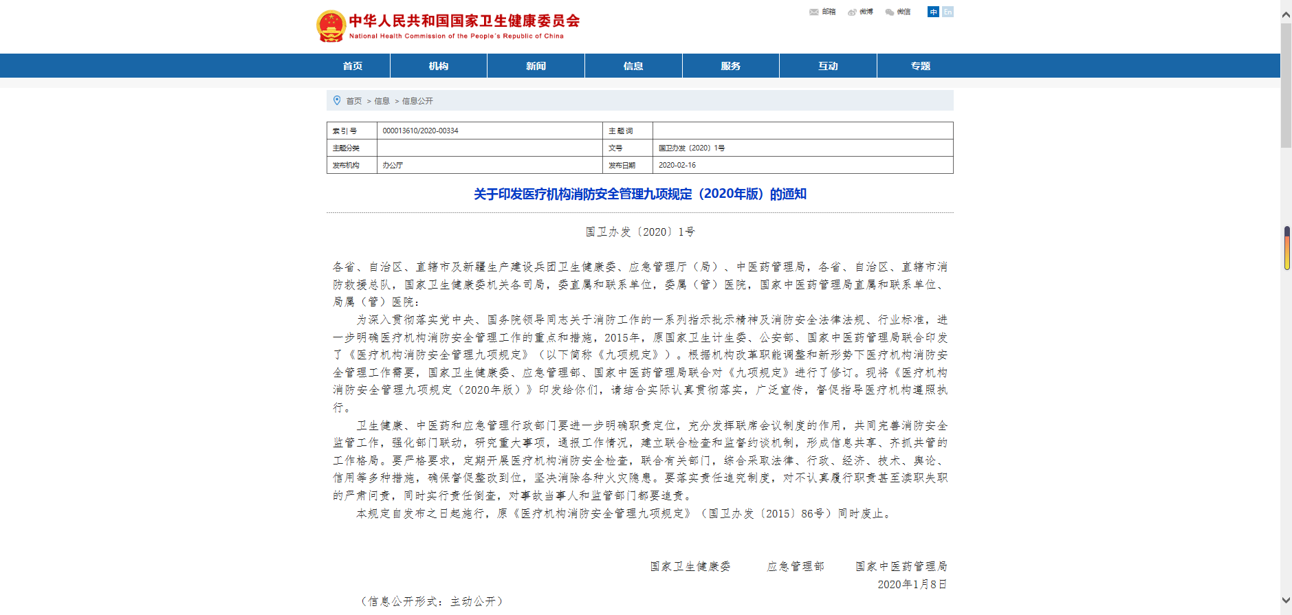 2020年1月8日,國(guó)家衛(wèi)健委、公安部與國(guó)家中醫(yī)藥管理局聯(lián)合印發(fā)《醫(yī)療機(jī)構(gòu)消防安全管理九項(xiàng)規(guī)(2020版)》,第六條強(qiáng)調(diào)了推進(jìn)'智慧消防建設(shè),促進(jìn)信息化與消防業(yè)務(wù)融合,提高醫(yī)療機(jī)構(gòu)火災(zāi)預(yù)警和防控能力。