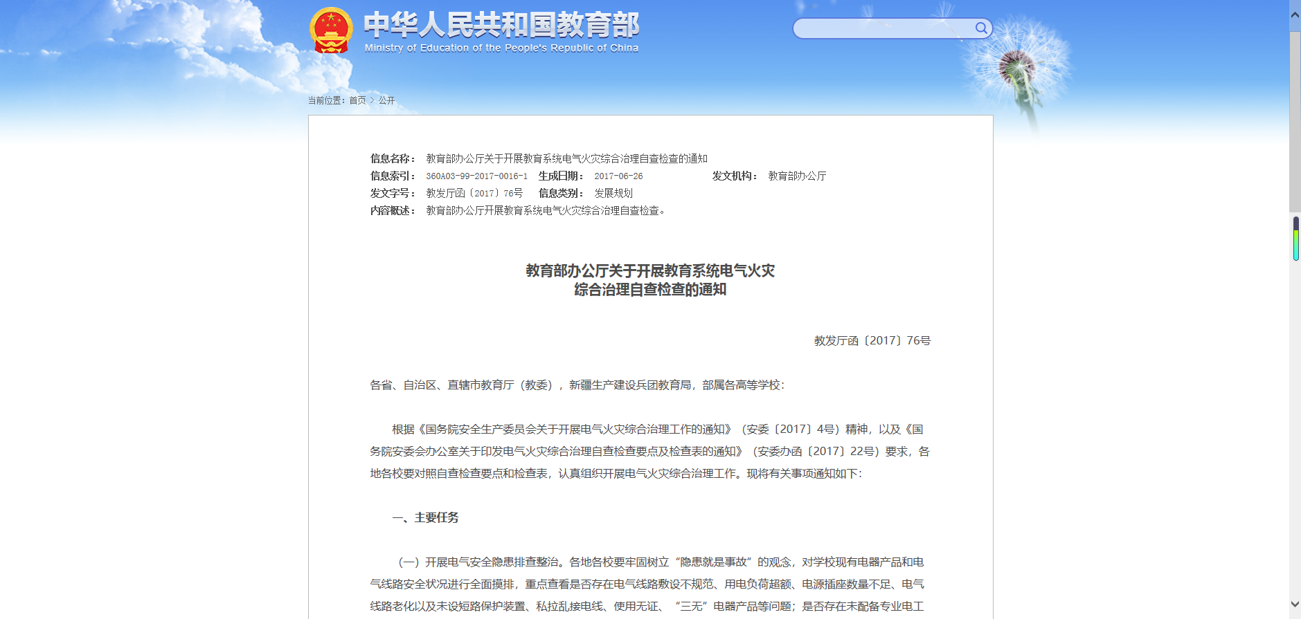 2017年6月26日,國家教育部辦公廳關(guān)于開展教育系統(tǒng)電氣火災(zāi)綜合治理自查檢查的通知,特別提出開展電氣安全隱患排查整治、突出重點(diǎn)領(lǐng)域電氣綜合治理、加強(qiáng)學(xué)校電氣安全使用管理、開展電氣安全宣傳教育的主要任務(wù)。